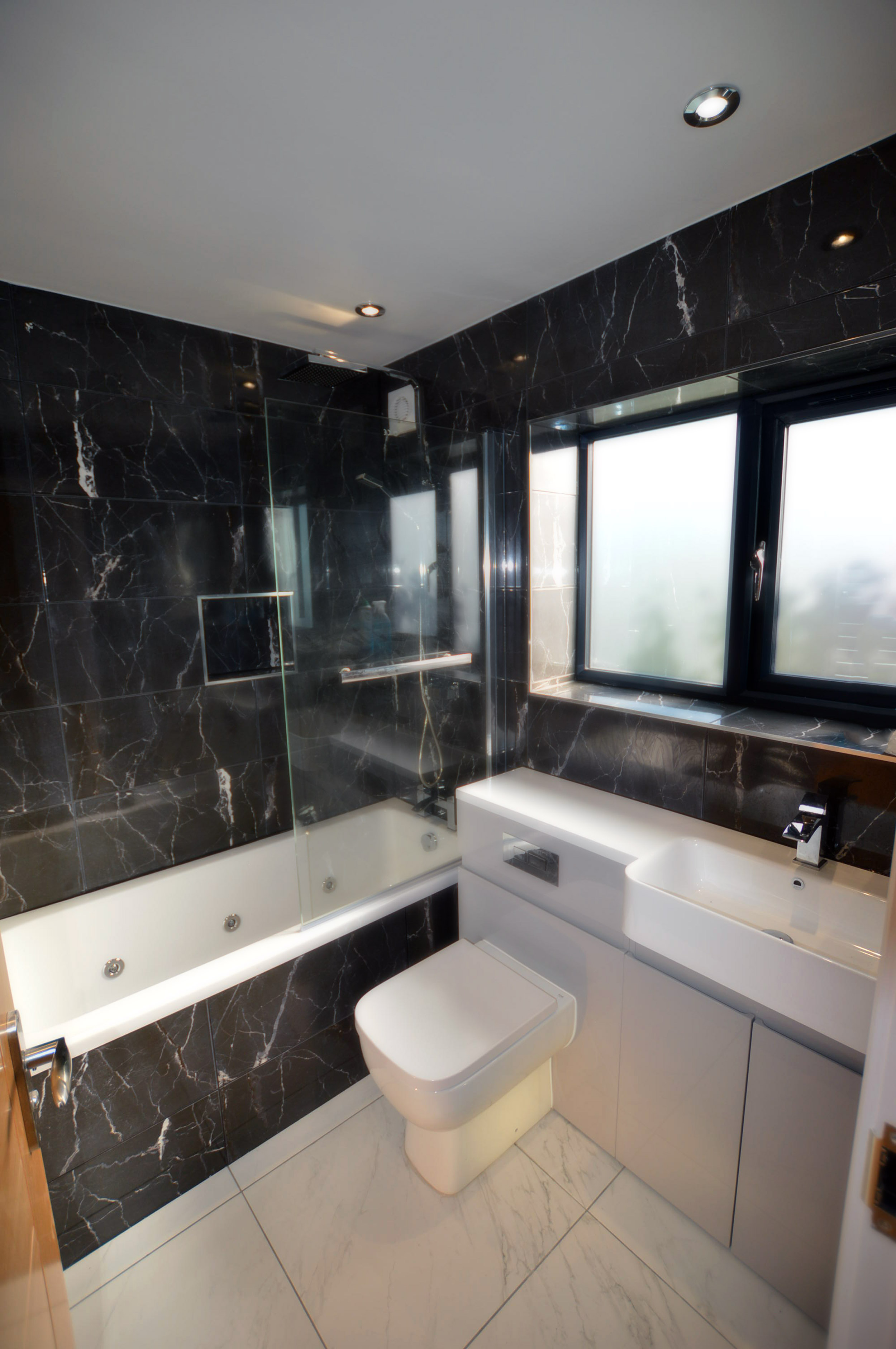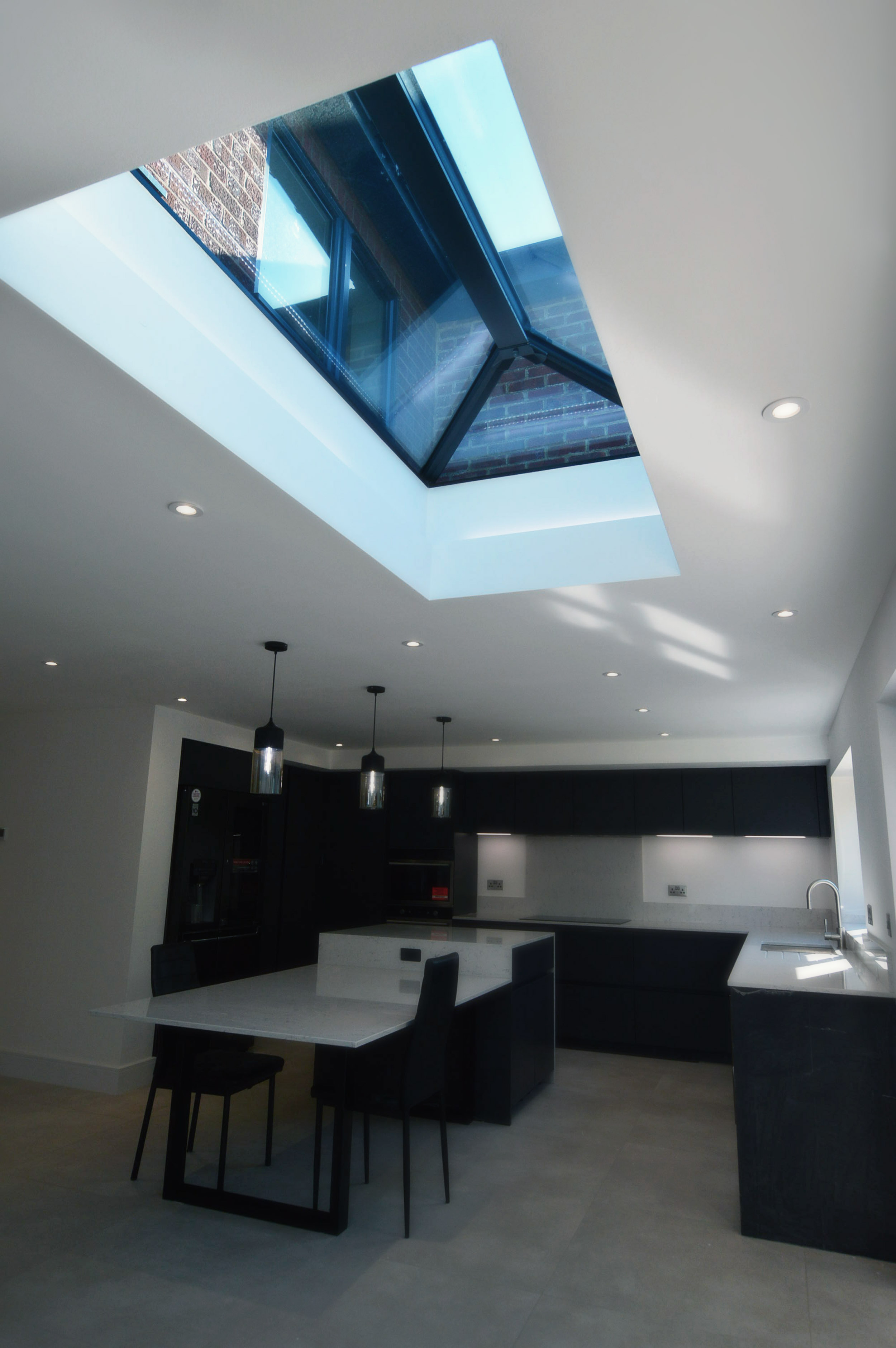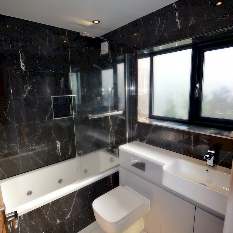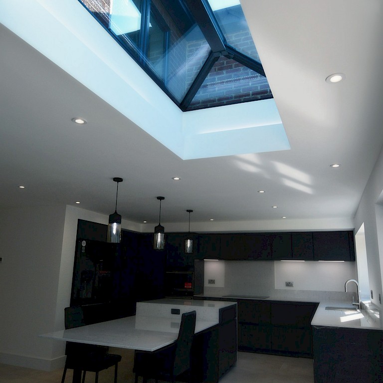 A growing family were looking for additional space to facilitate as many bedrooms as possible in a new property following the architect design that they supplied. We constructed a two-storey rear extension with a single storey and roof light over the dining area. There were access issues with the site however with careful planning we made sure the project ran smoothly with minimal interference to the surrounding area. For the kitchen and bathrooms, the client had a clear plan from the start what they wanted including the fit-out products. We made sure that the client’s desires were met and everything was fitted correctly, this included a detailed lighting plan with spots and pendants in specific areas to service the living areas and dining room. Thelo suggested some improvements to the plan e.g. installing an LED lighting strip in a concealed part of the roof light.