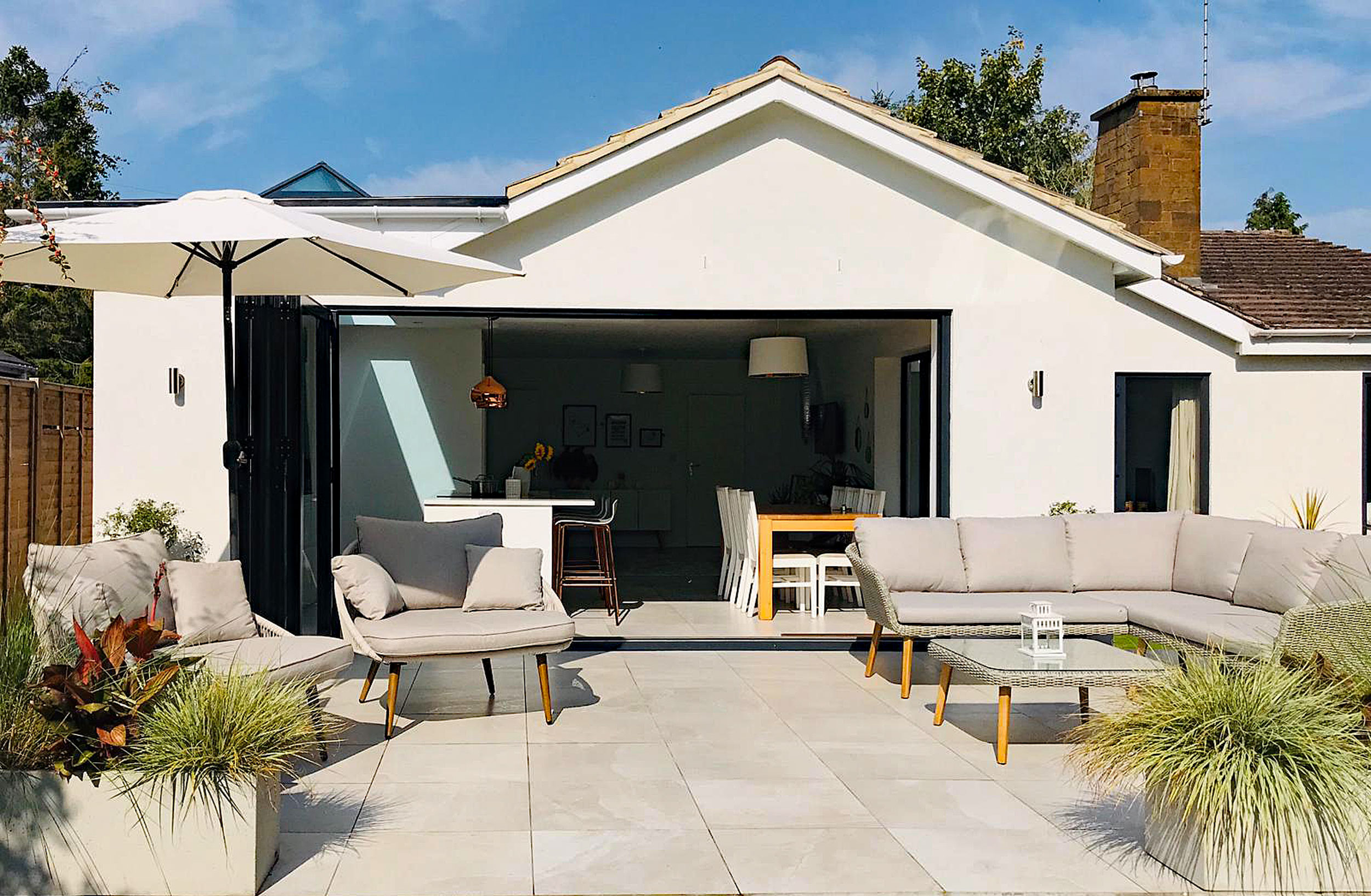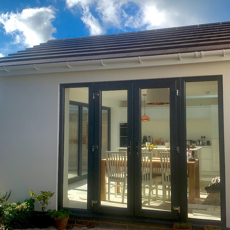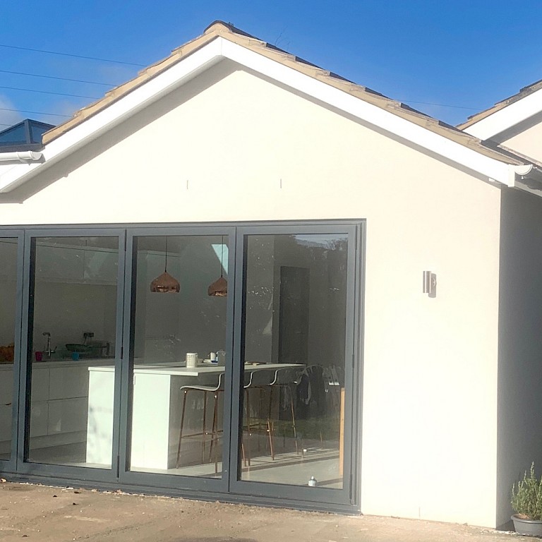 We constructed a single-storey rear extension featuring a combination of flat and gable roofing, complemented by elegant four-leaf bifold doors. To enhance the indoor-outdoor flow, matching tiles were laid throughout the interior and exterior spaces, complete with a low profile sill for a clean, cohesive finish.