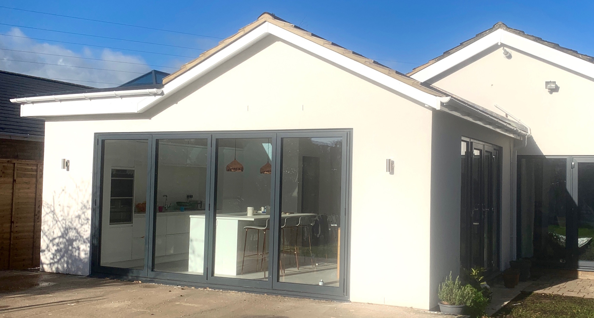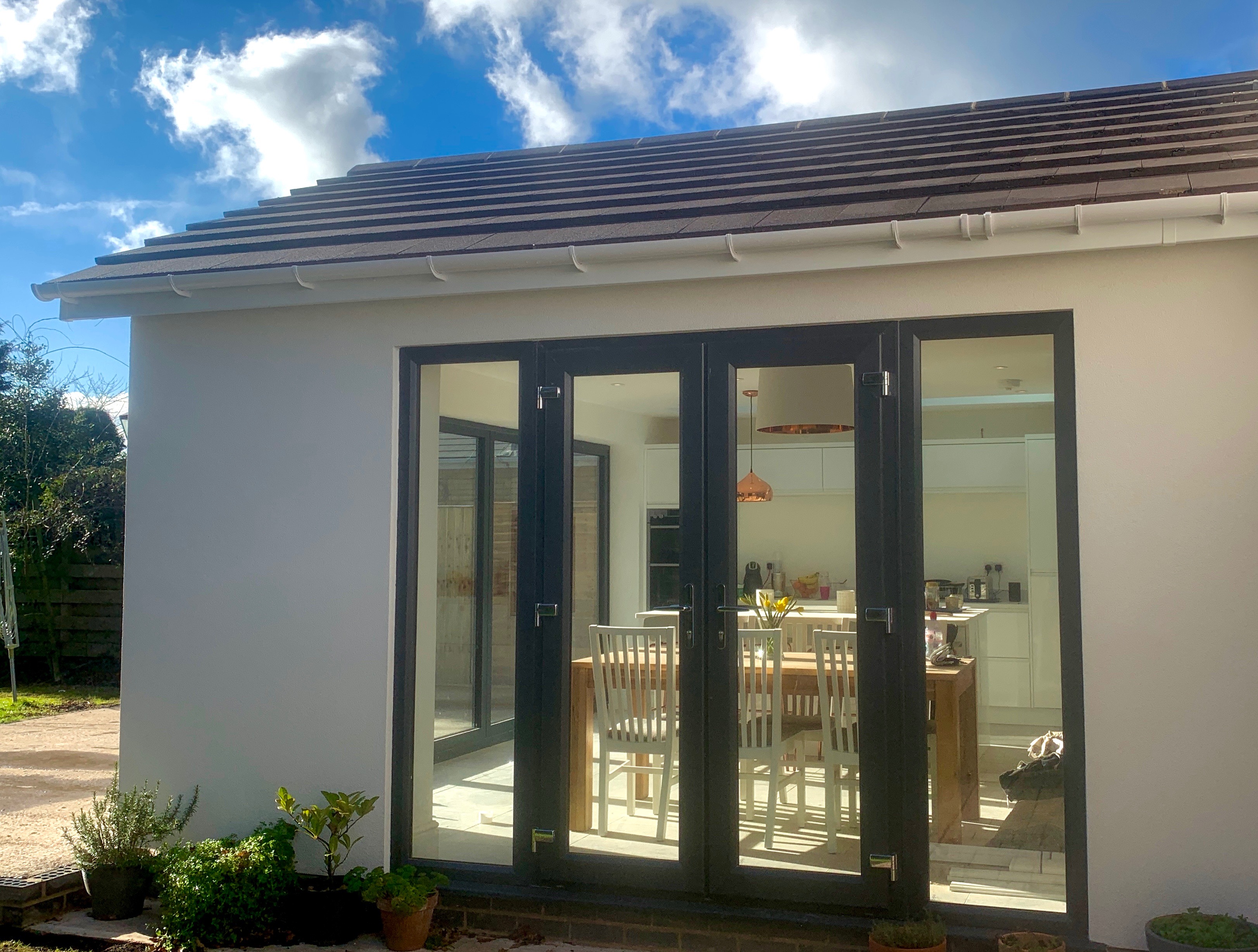 To maintain visual consistency, we spray-painted the existing rear uPVC window frames to match the new anthracite grey frames and doors. The rear elevation of the home was re-rendered with white monocouche render, preparing the property for landscaping and tiling works at the front and side.