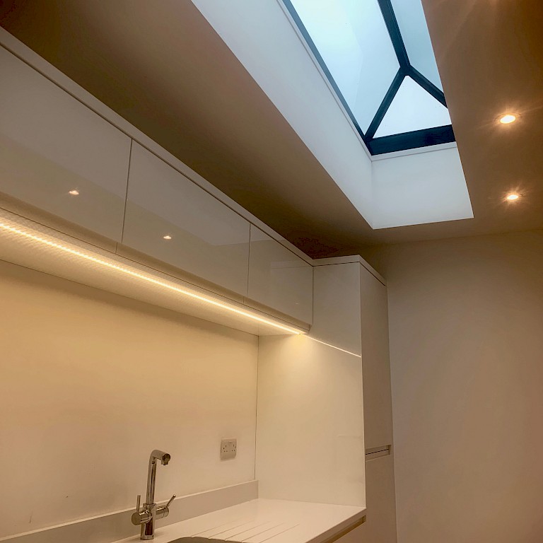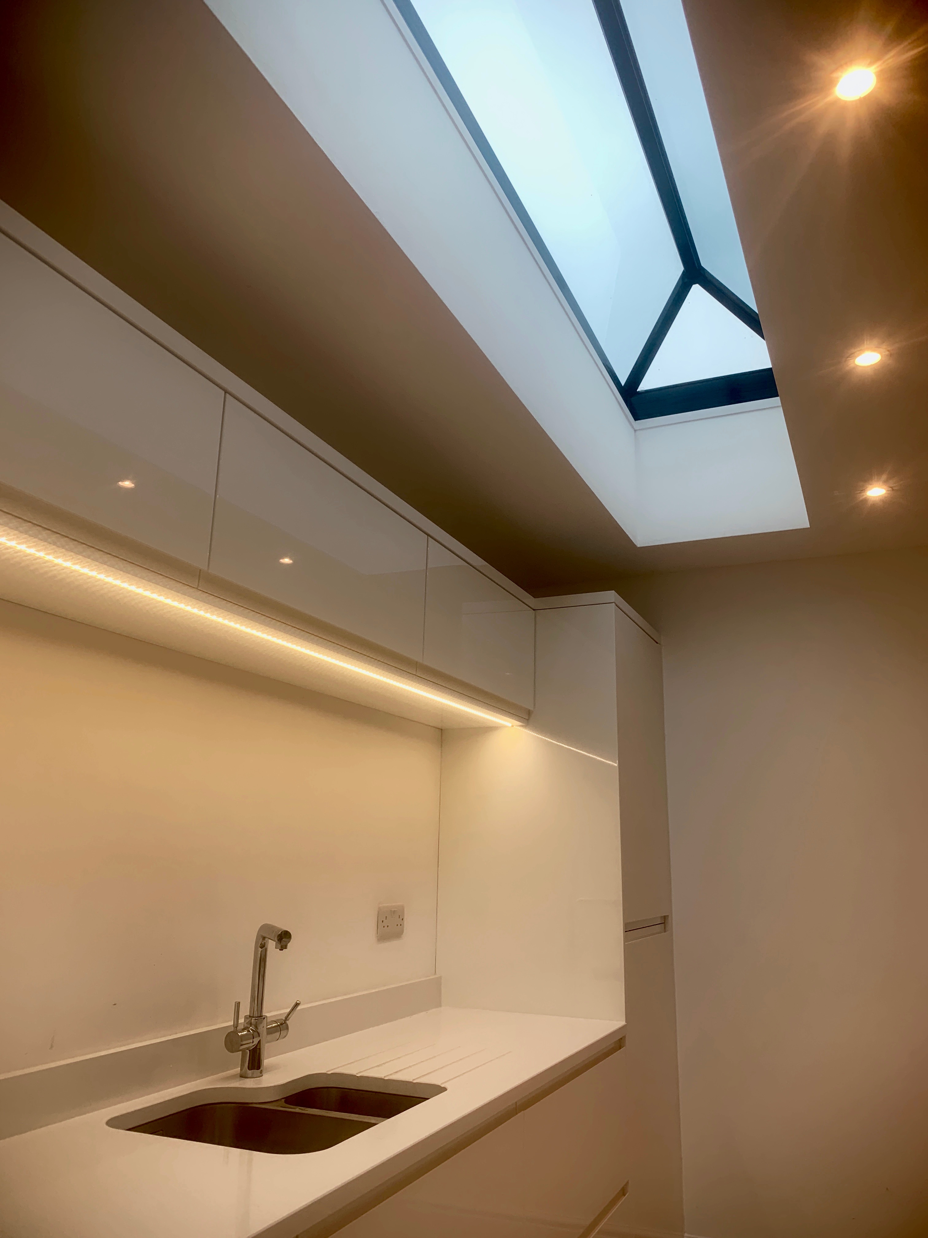Natural light was a key design focus, achieved through the installation of roof lights and a domed skylight, flooding the new kitchen area with daylight. A dedicated utility space was also added, improving functionality and helping to streamline everyday family life.