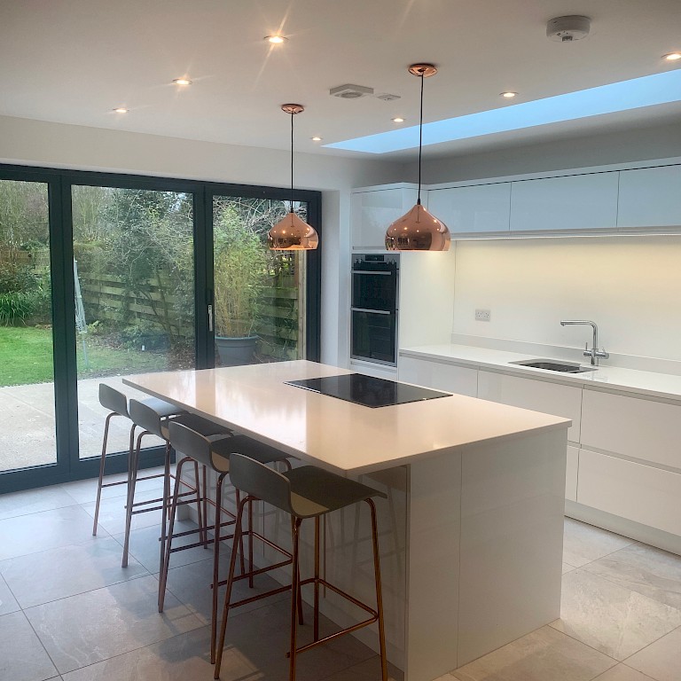 This bespoke kitchen extension was designed for a growing family looking to create a seamless connection between their indoor and outdoor spaces. The goal was to maximise the footprint of their home and garden, creating one large, open-plan area perfect for modern family living.