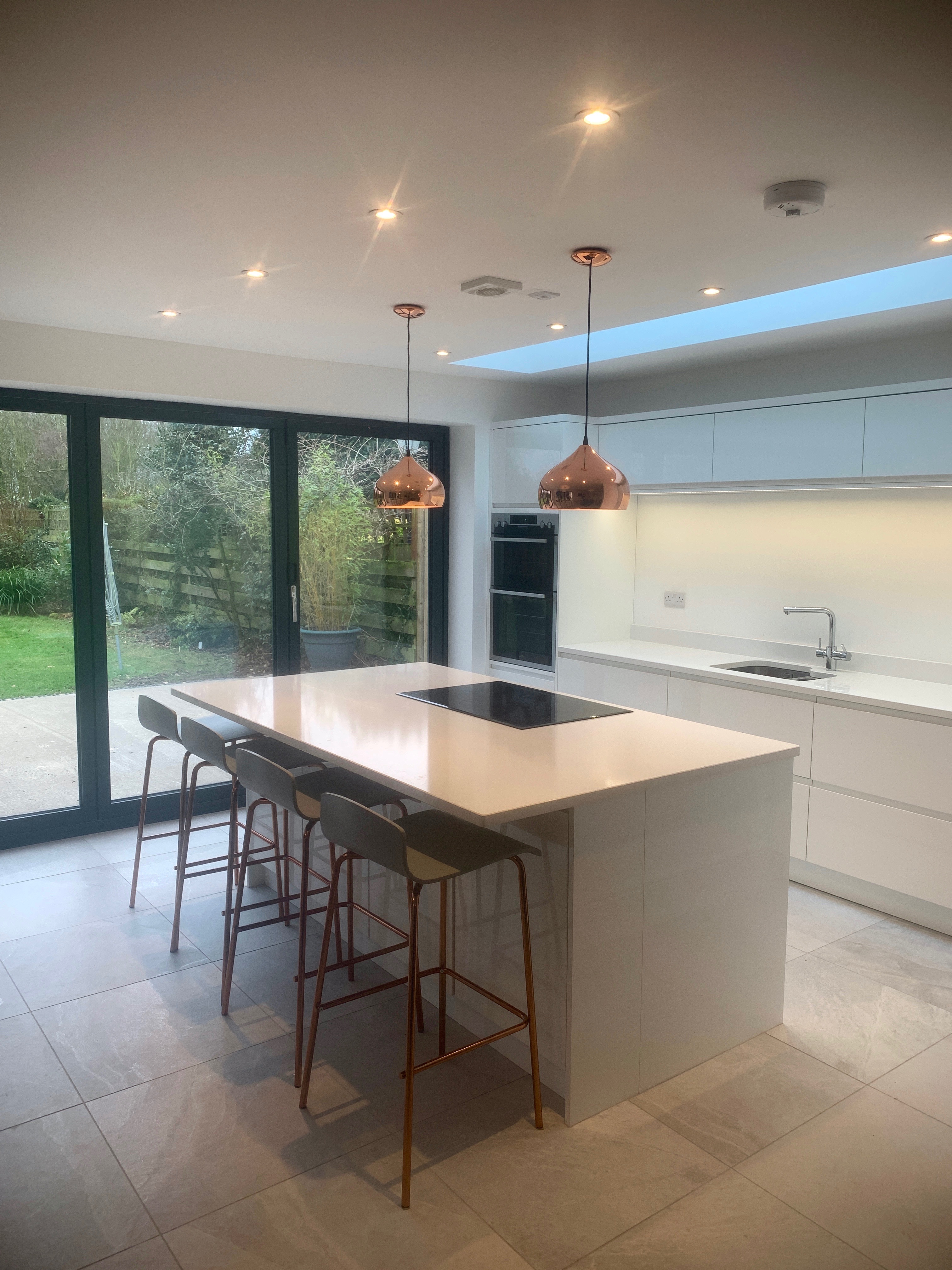 The project was completed with the installation of a sleek, modern kitchen featuring a central island — combining style, practicality, and a sociable layout ideal for family gatherings.