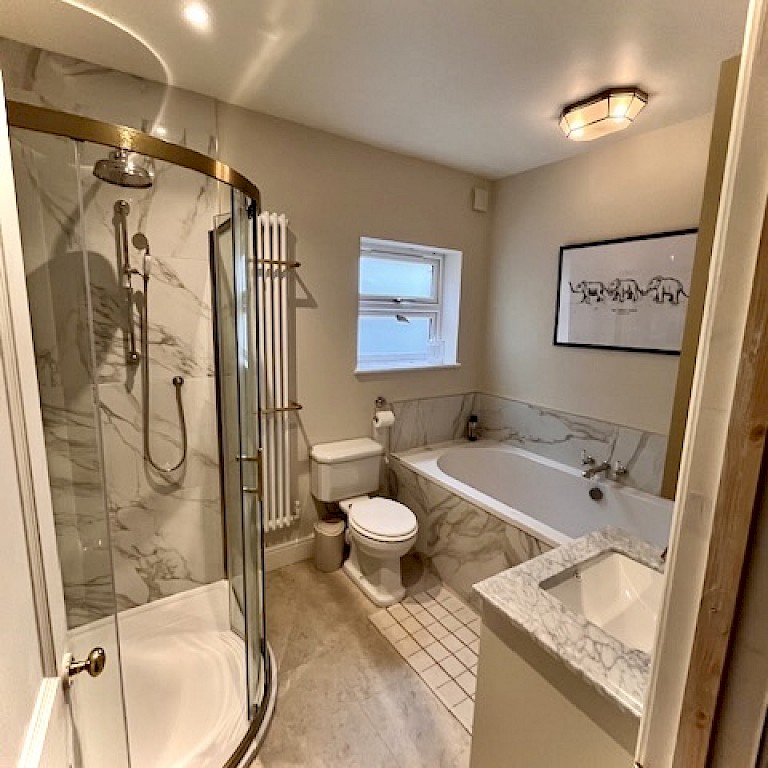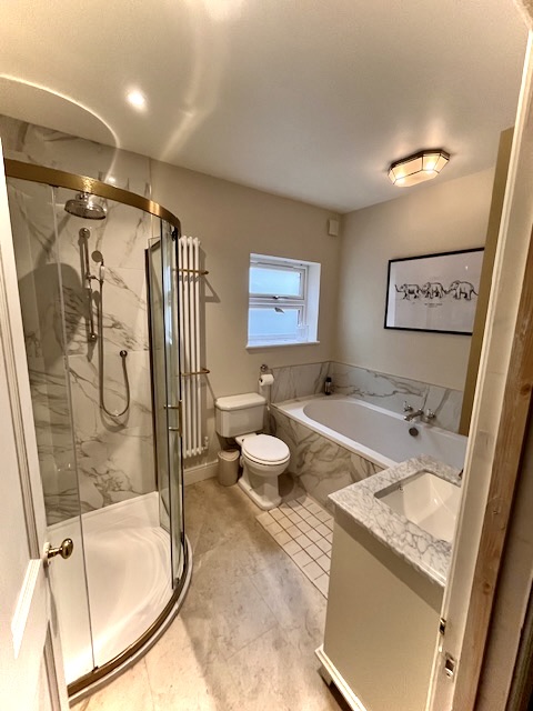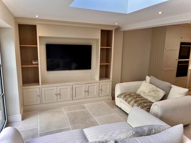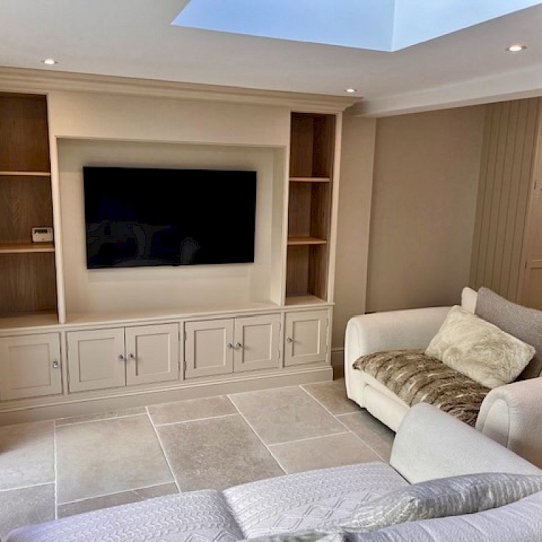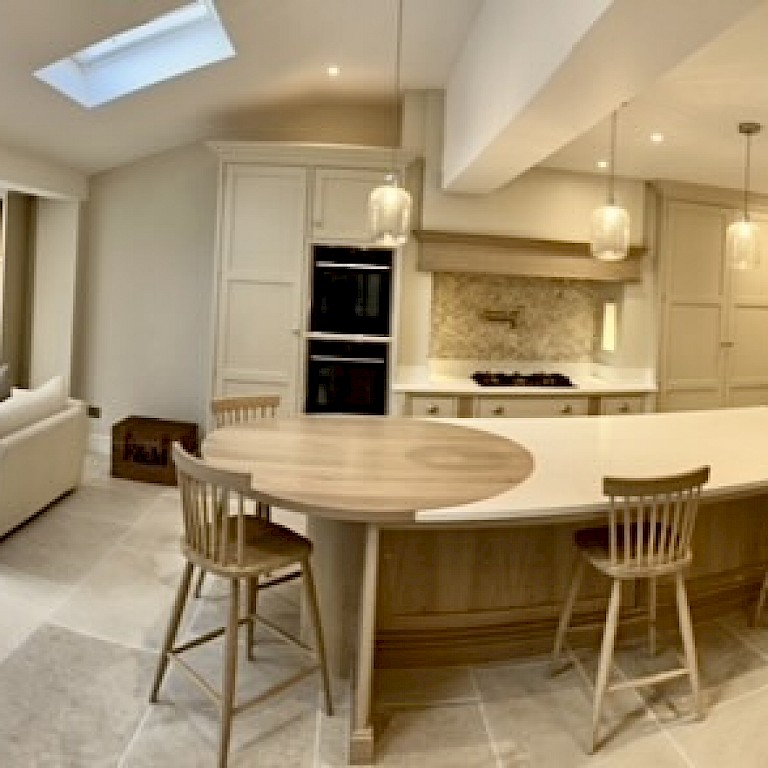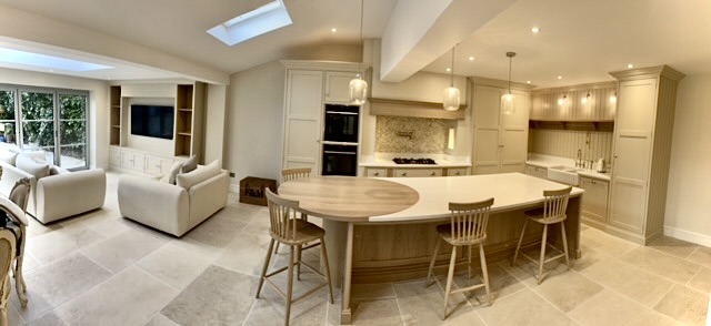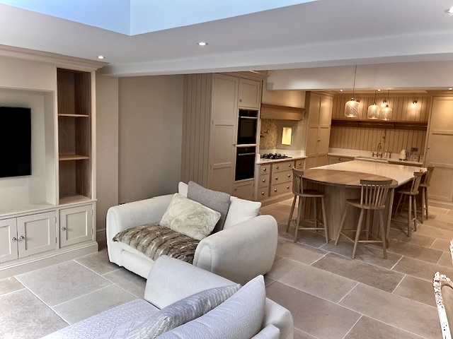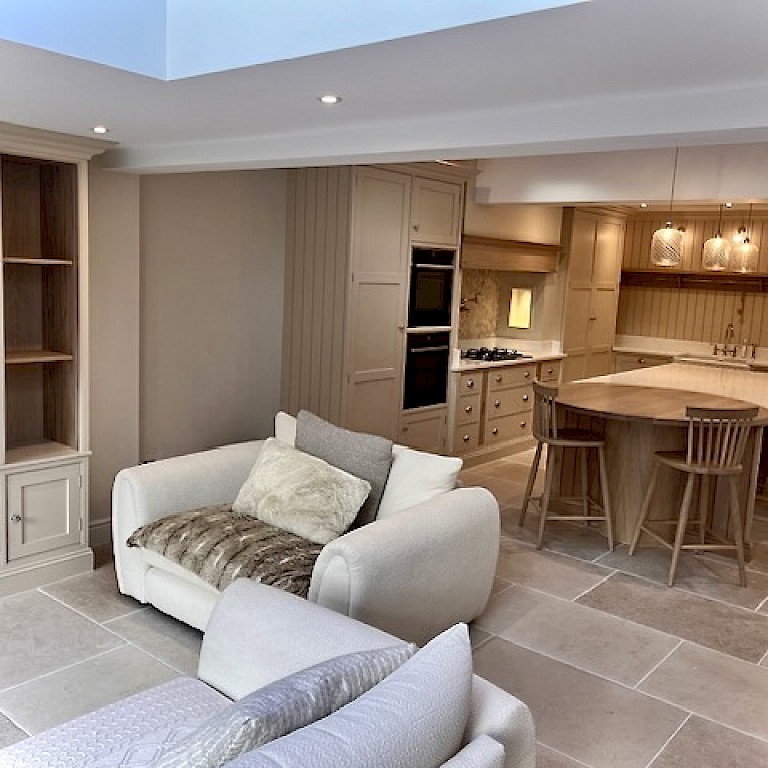 Installation of Velux windows and bifold doors enabled maximum light to flood into the space. Under the new travertine floor tiles, we installed underfloor heating throughout enabling the large area to maintain a constant comfortable temperature.